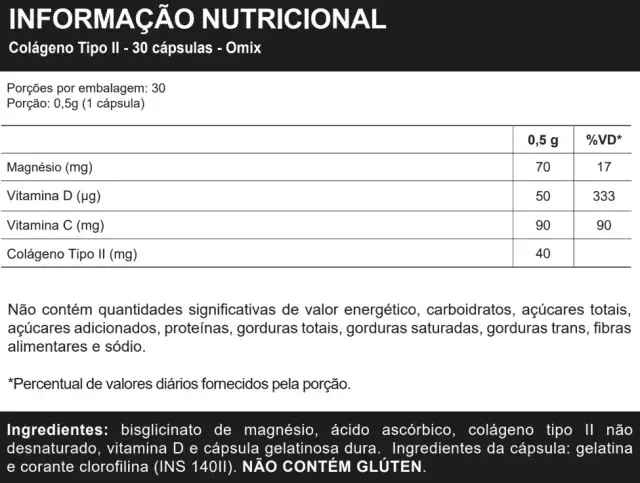 - Ingredientes: Bisglicinato de magnésio, ácido ascórbico, colágeno tipo II não desnaturado, vitamina D e cápsula gelatinosa dura. NÃO CONTÉM GLÚTEN. Ingredientes da cápsula: gelatina e corantes clorofilina (INS 140II).